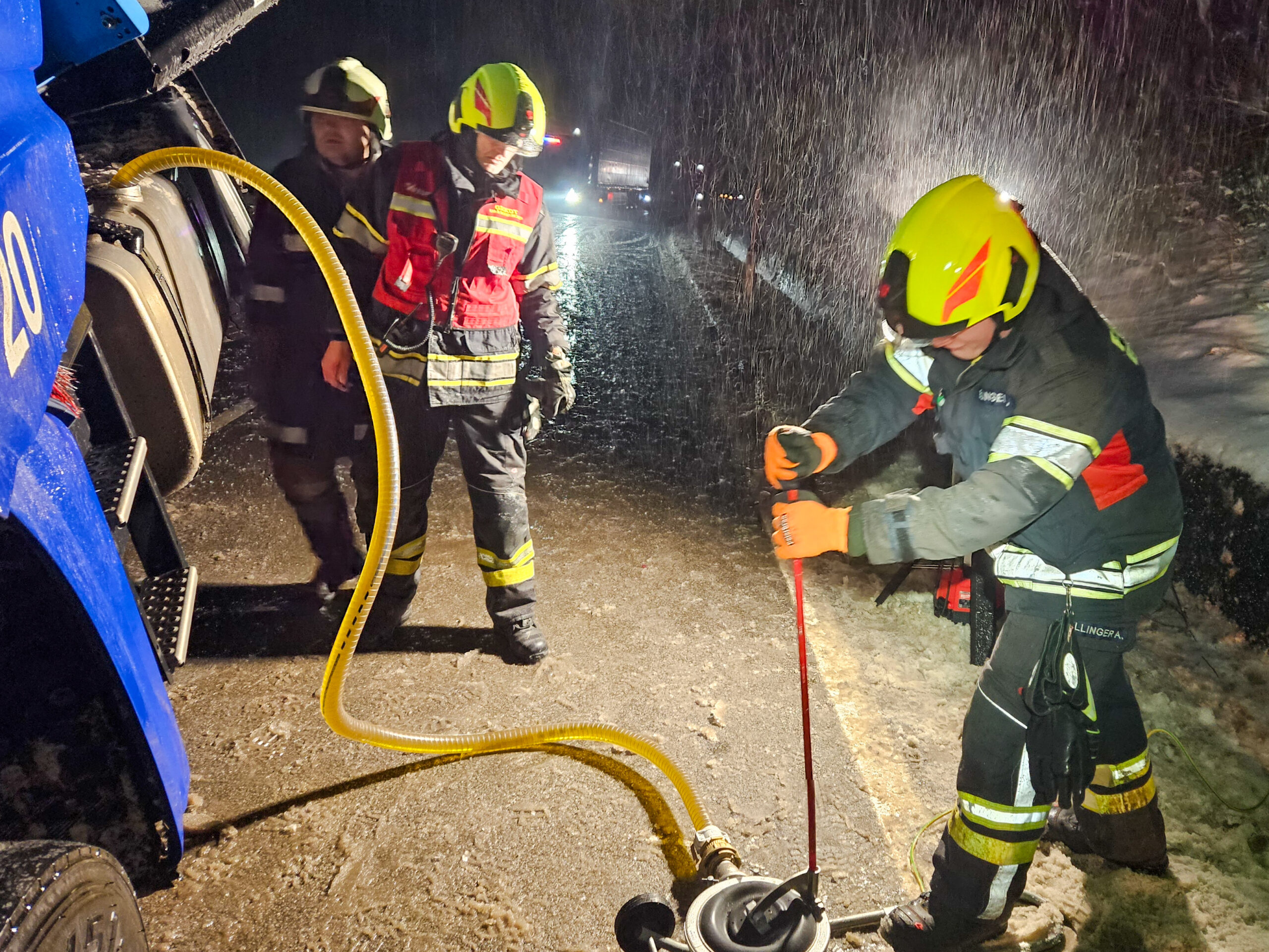 Nachdem die beiden PKW´s mit Hilfe von Abschleppdiensten von der Fahrbahn entfernt werden konnten, musste für die Bergung des LKW´s eine Spezialbergefirma anrücken. Vor Beginn der Bergung, mussten wir den Tank des Schwerfahrzeuges mit Hilfe einer Spezialpumpe entleeren sowie mit dem Umladen des Auflegers beginnen. Dank der zahlreichen Einsatzkräfte unserer Feuerwehr, konnte das Umladen schnell und professionell erledigt werden.