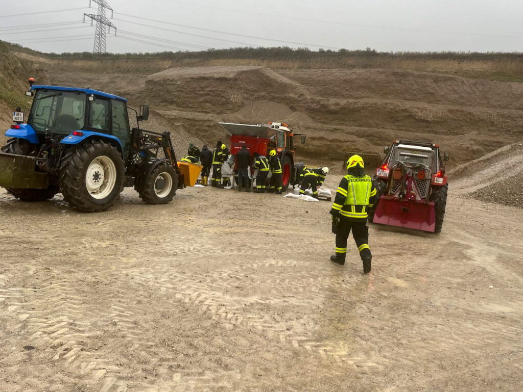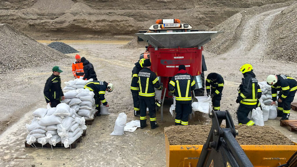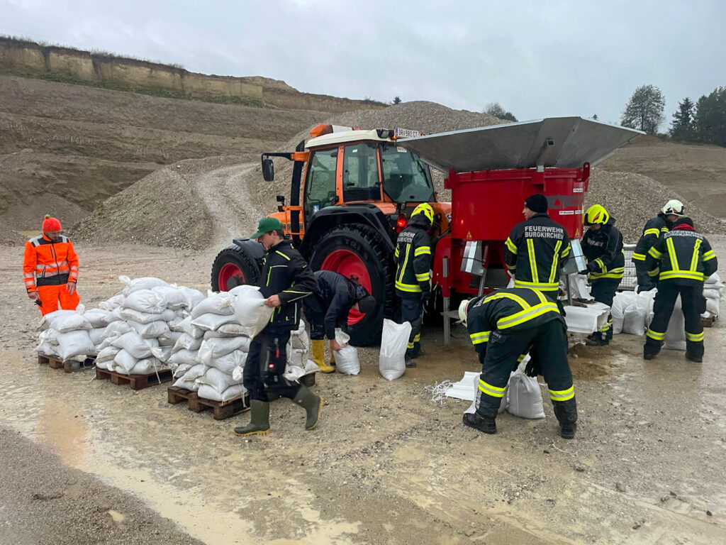 Weiters unterstützen wir unsere Kameraden von der Freiwilligen Feuerwehr Neukirchen/Enknach in der Schottergrube in Weikerding bei der Befüllung von Sandsäcken, welche in unserer Nachbargemeinde dringend zum Hochwasserschutz benötigt wurden. Dazu wurde die bei uns in Burgkirchen stationierte Sandsackfüllmaschine vom Krisenstab des Bezirkes Braunau angefordert und alarmiert und von Mitarbeitern des Bauhofes unserer Gemeinde sowie Helfern aus unserer Wehr betrieben.