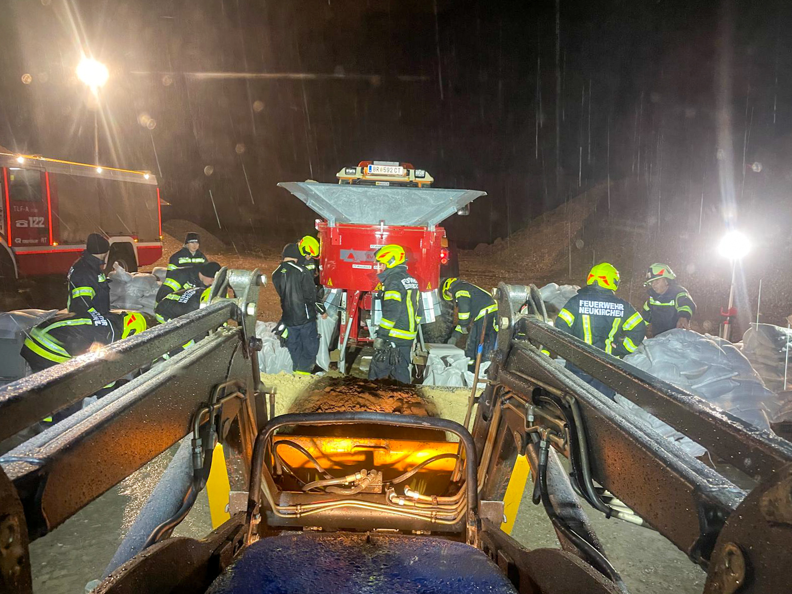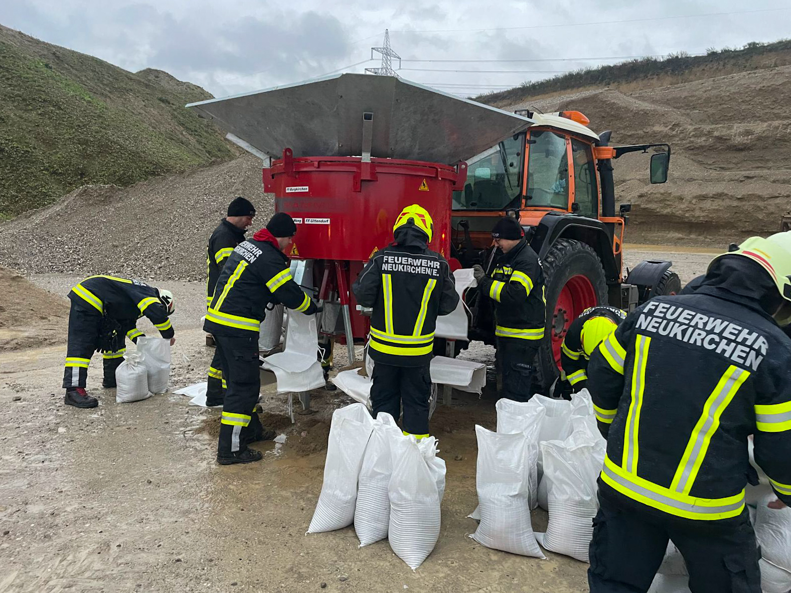 Weiters unterstützen wir unsere Kameraden von der Freiwilligen Feuerwehr Neukirchen/Enknach in der Schottergrube in Weikerding bei der Befüllung von Sandsäcken, welche in unserer Nachbargemeinde dringend zum Hochwasserschutz benötigt wurden. Dazu wurde die bei uns in Burgkirchen stationierte Sandsackfüllmaschine vom Krisenstab des Bezirkes Braunau angefordert und alarmiert und von Mitarbeitern des Bauhofes unserer Gemeinde sowie Helfern aus unserer Wehr betrieben.