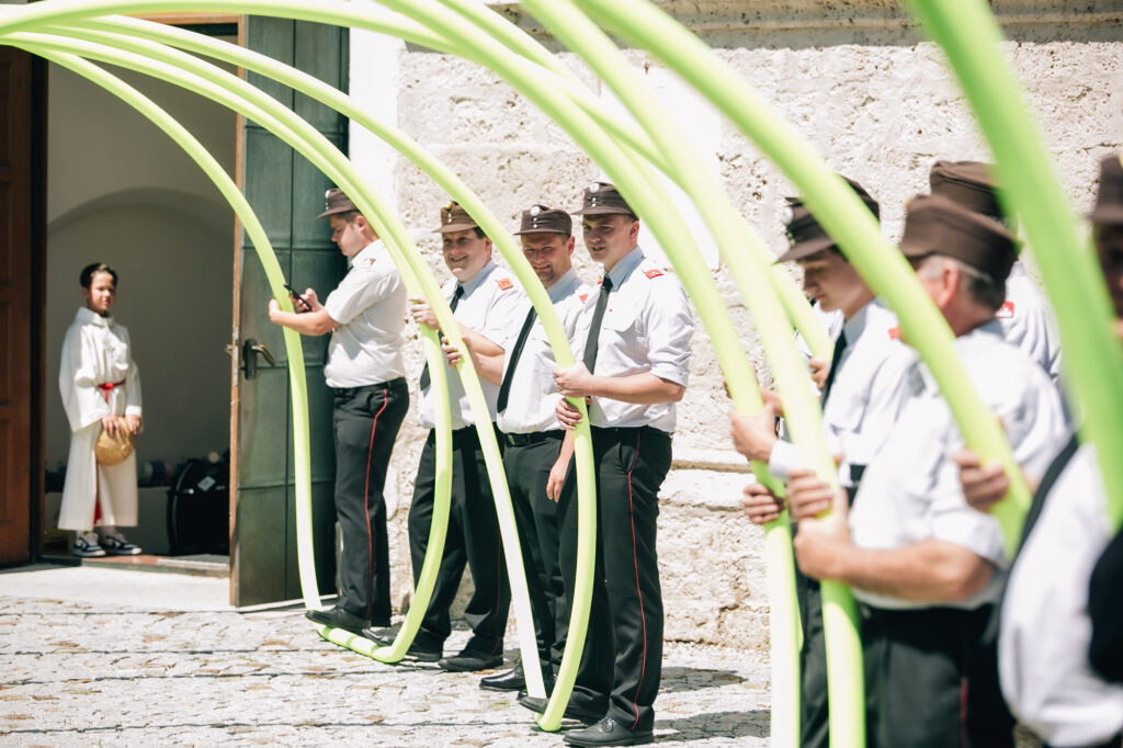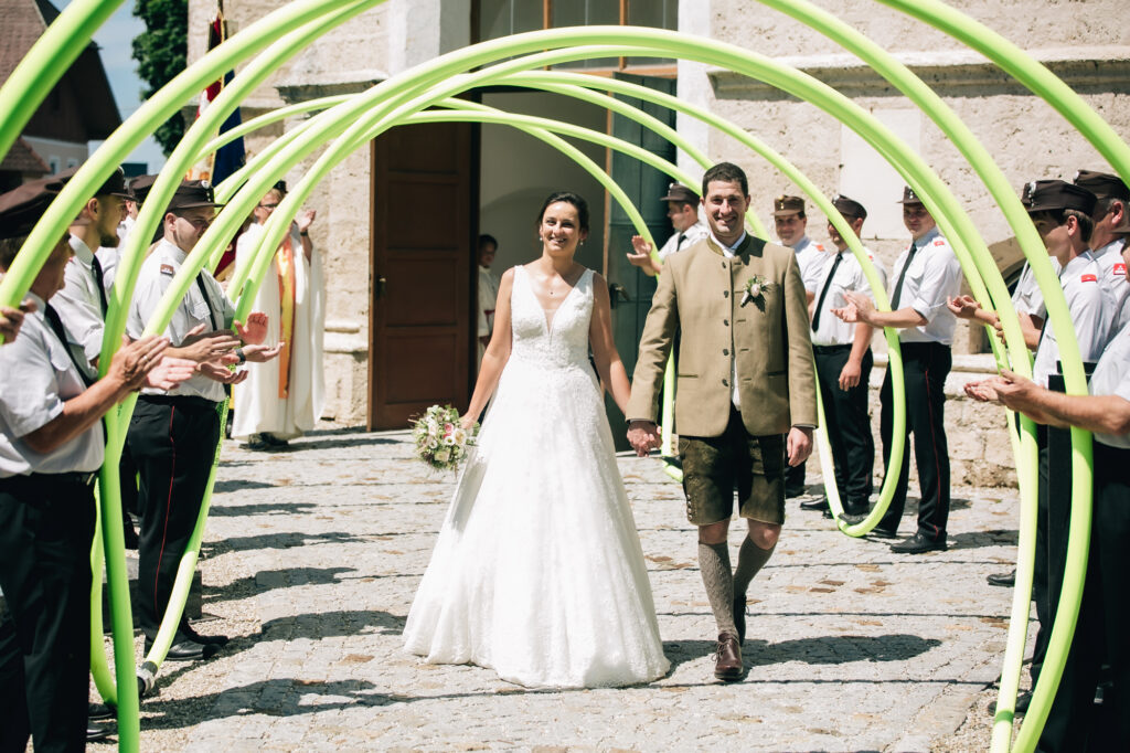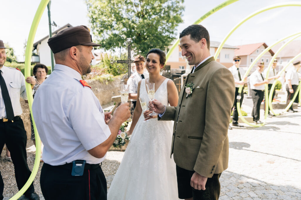 Nach der kirchlichen Trauung in der Pfarrkirche Burgkirchen, empfingen wir das frisch vermählte Brautpaar vor der Kirchentür mit einem Schlauchspalier. Natürlich ließen wir das Brautpaar hoch leben und stießen auf ihr Glück an.