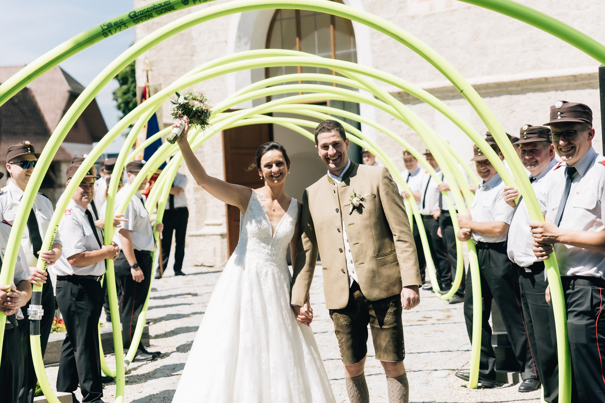 Nach der kirchlichen Trauung in der Pfarrkirche Burgkirchen, empfingen wir das frisch vermählte Brautpaar vor der Kirchentür mit einem Schlauchspalier. Natürlich ließen wir das Brautpaar hoch leben und stießen auf ihr Glück an.