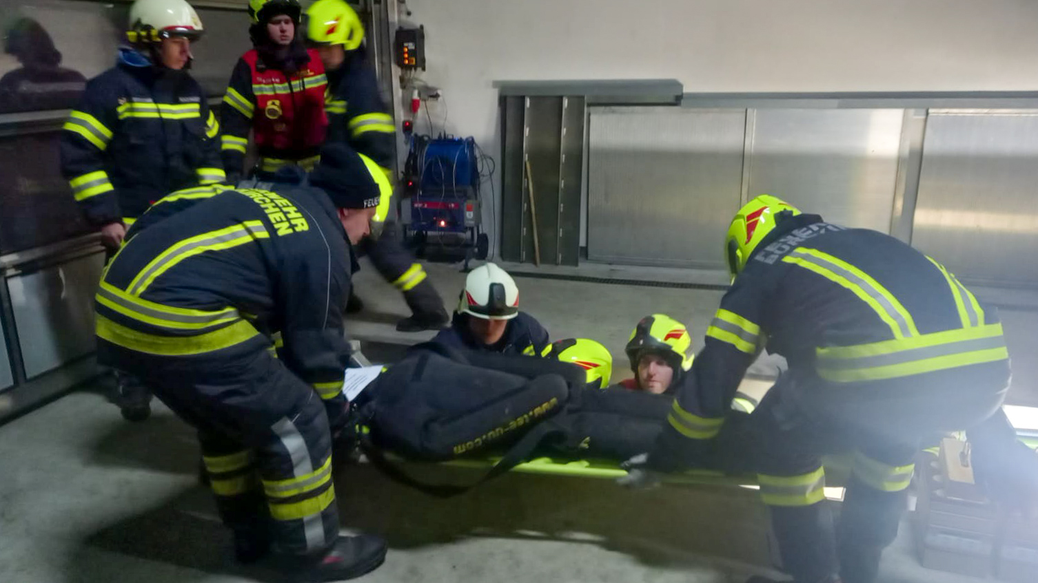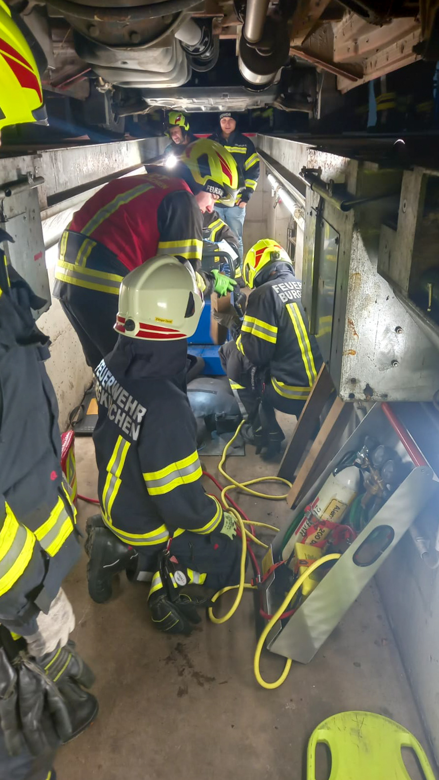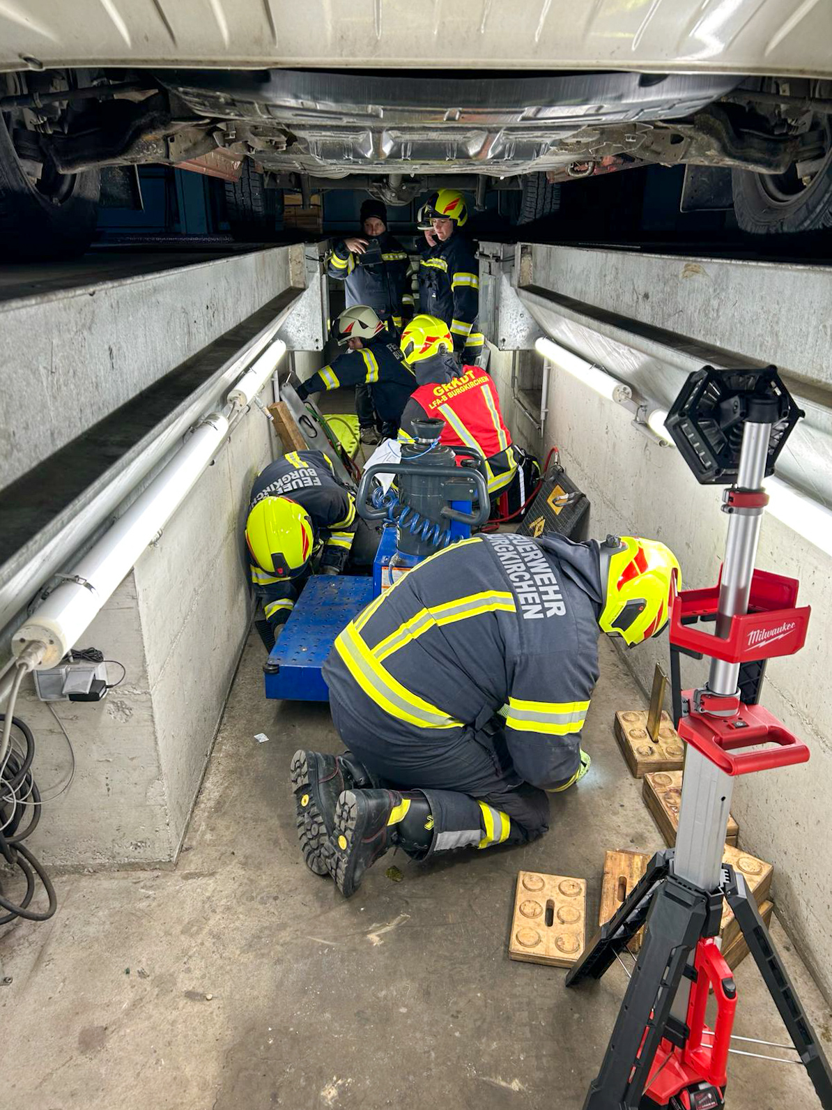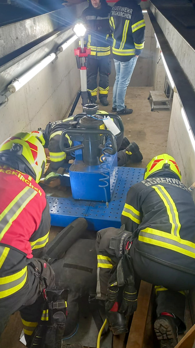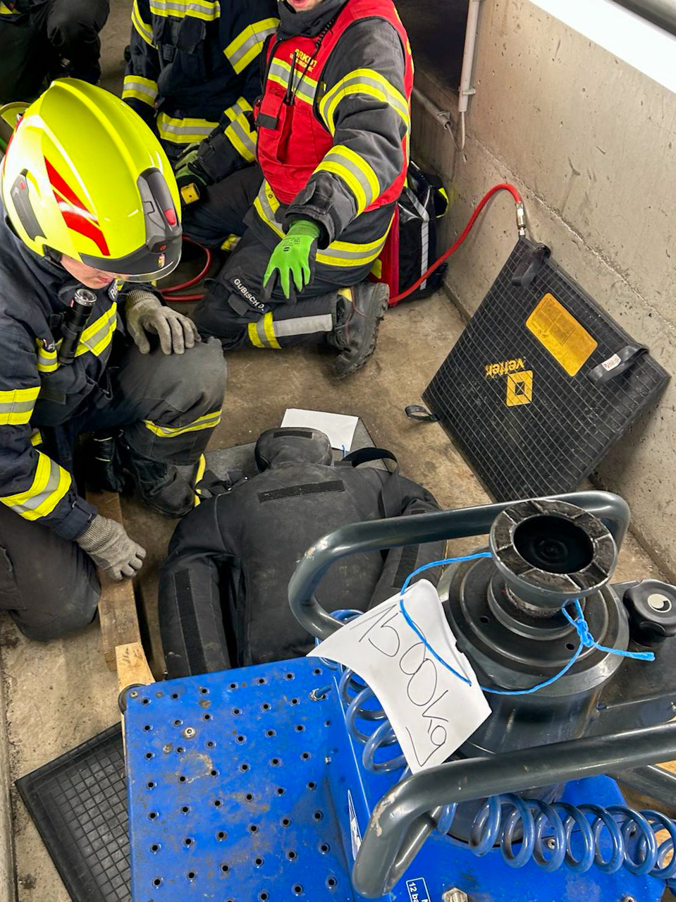 Übungsannahme war eine durch einen schweren Gegenstand in einer Montagegrube eingeklemmten Person, welche es zu befreien, zu versorgen und zu retten galt.