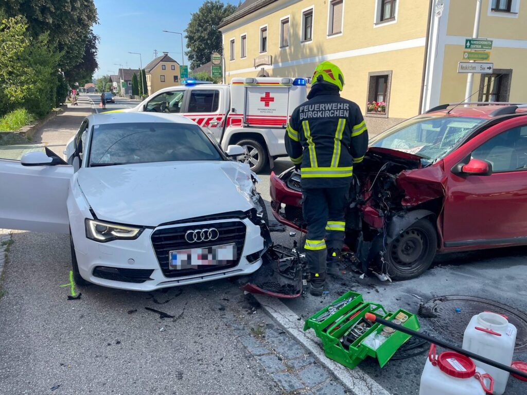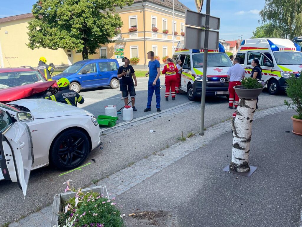 Am Samstag, 27. Juli 2024, wurden wir zu einem Verkehrsunfall auf die Kreuzung B147/L1053 („Mauch-Kreuzung“) im Ortszentrum von Burgkirchen alarmiert.